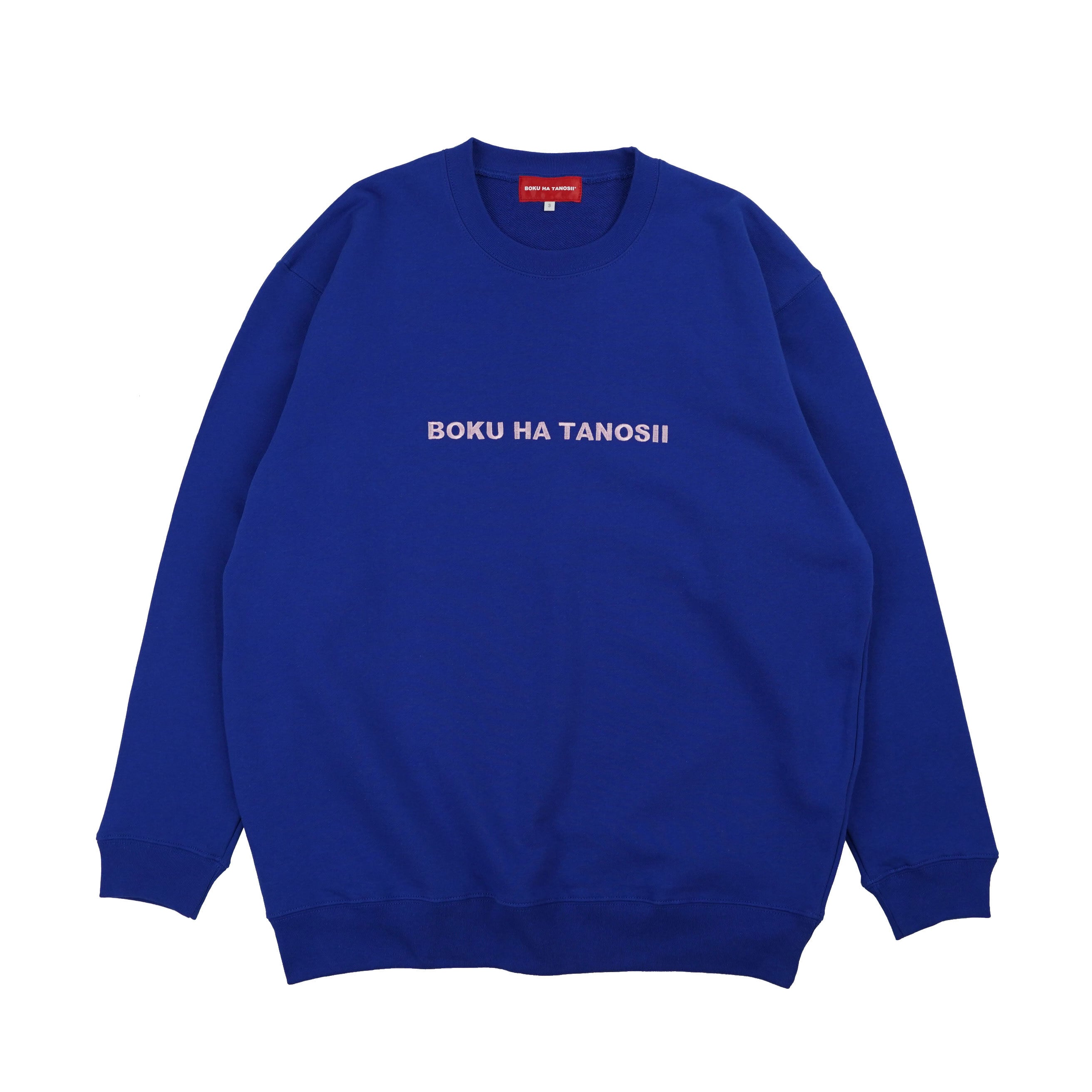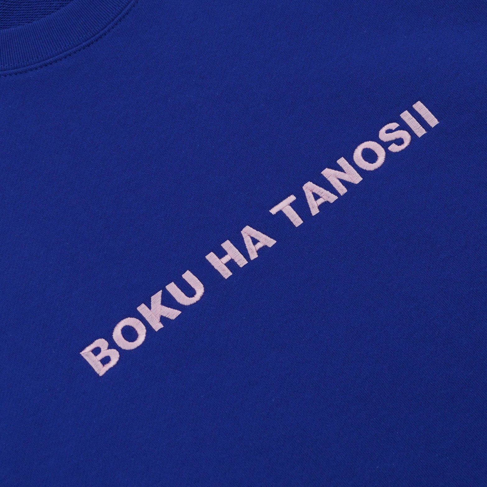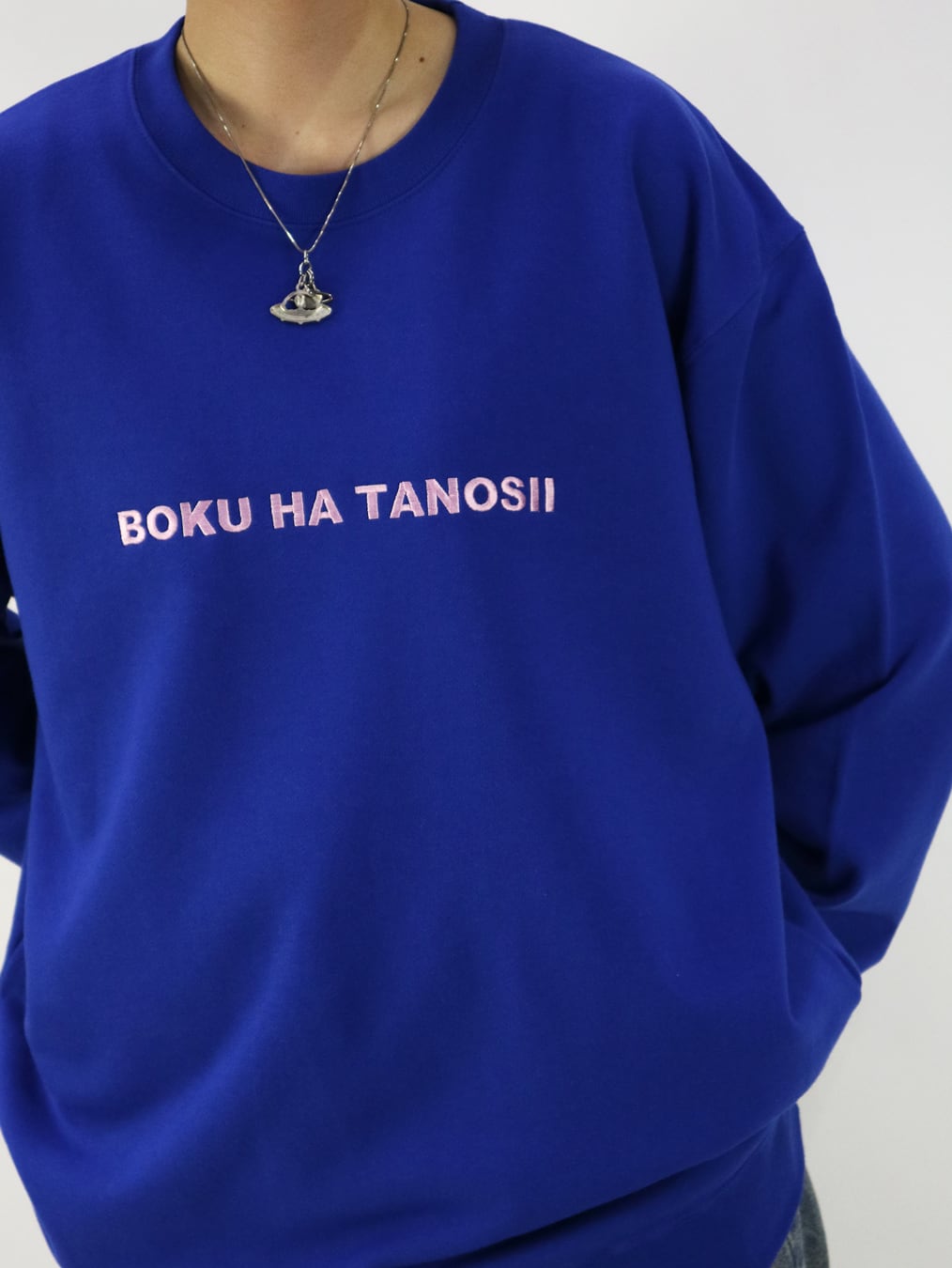 マリンブルーボディにライトピンク刺繍で施されたBOKU HA TANOSII