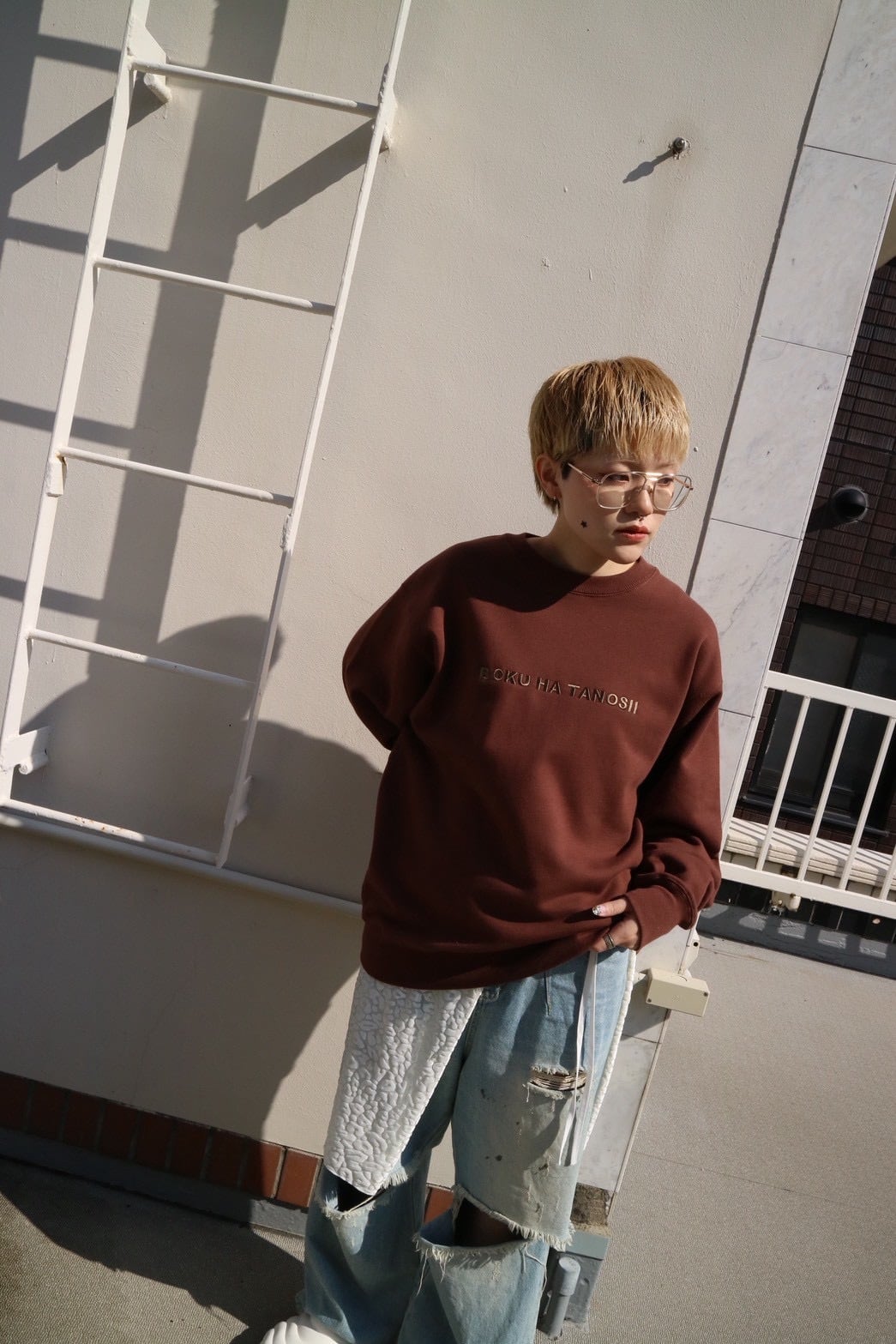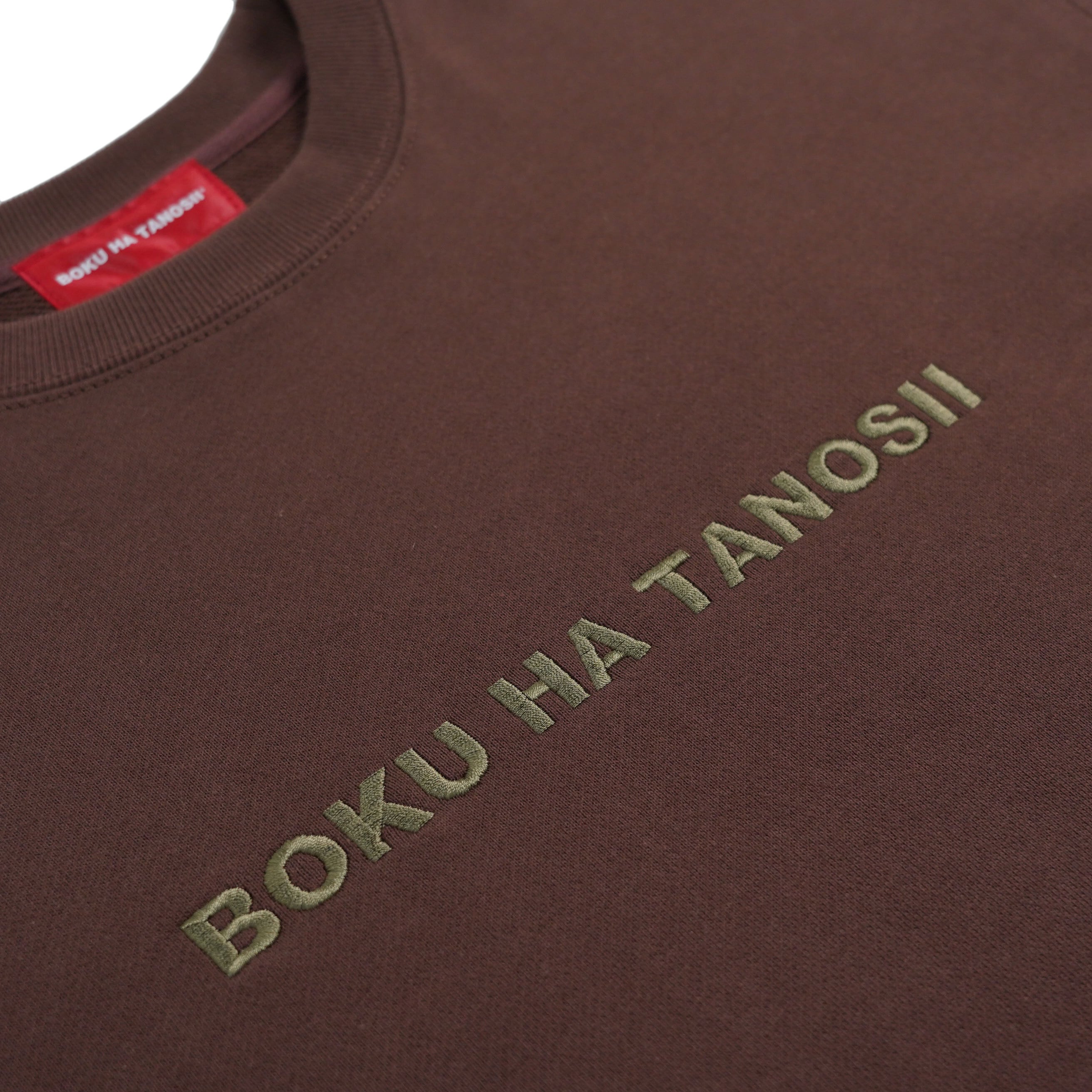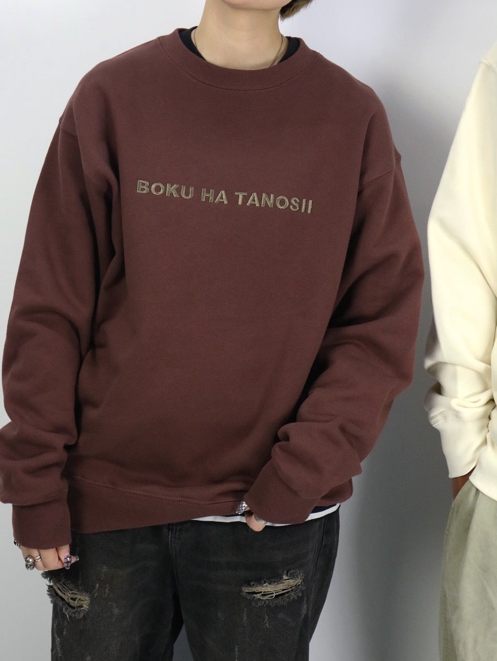シナモンブラウンにグレージュ刺繍で施されたBOKU HA TANOSII