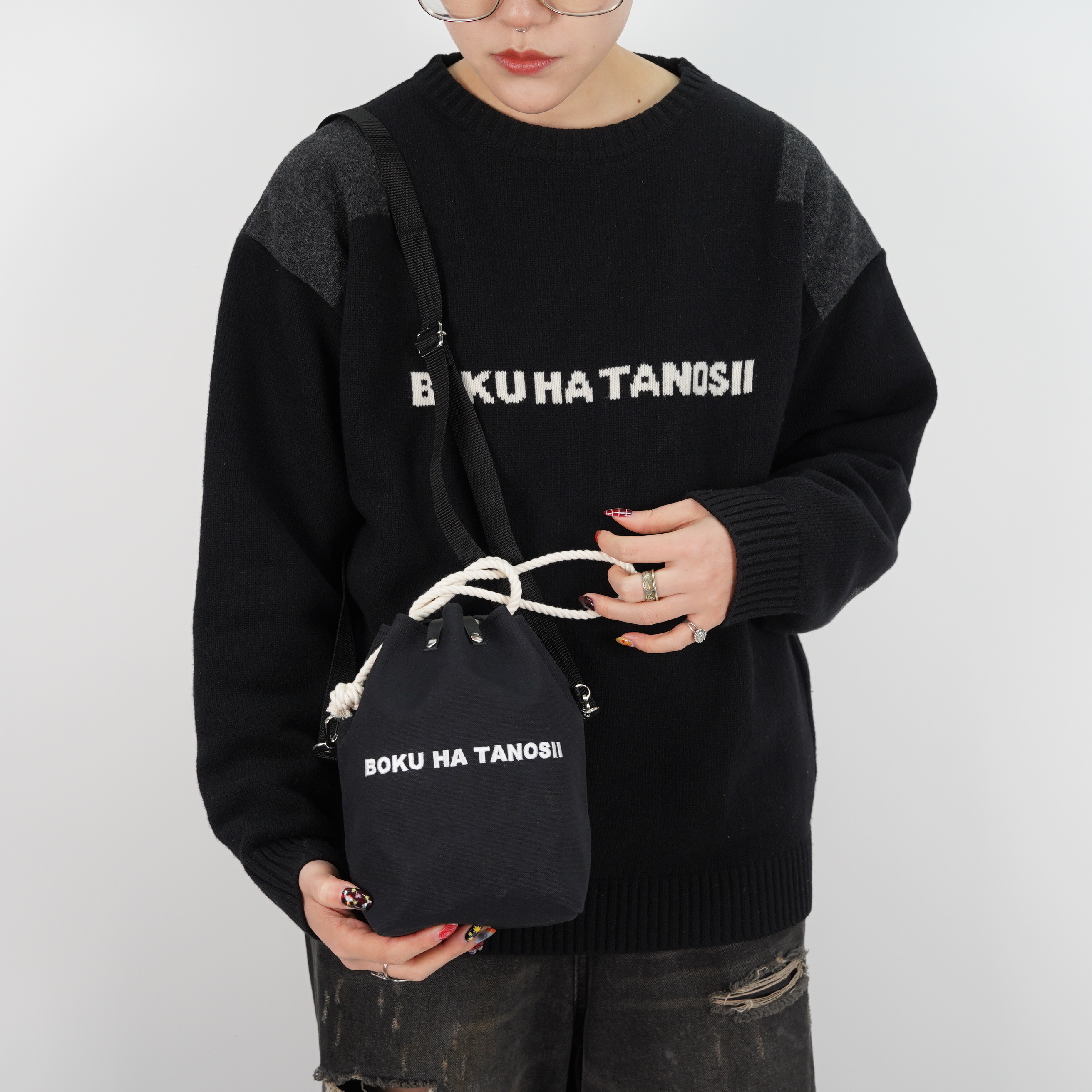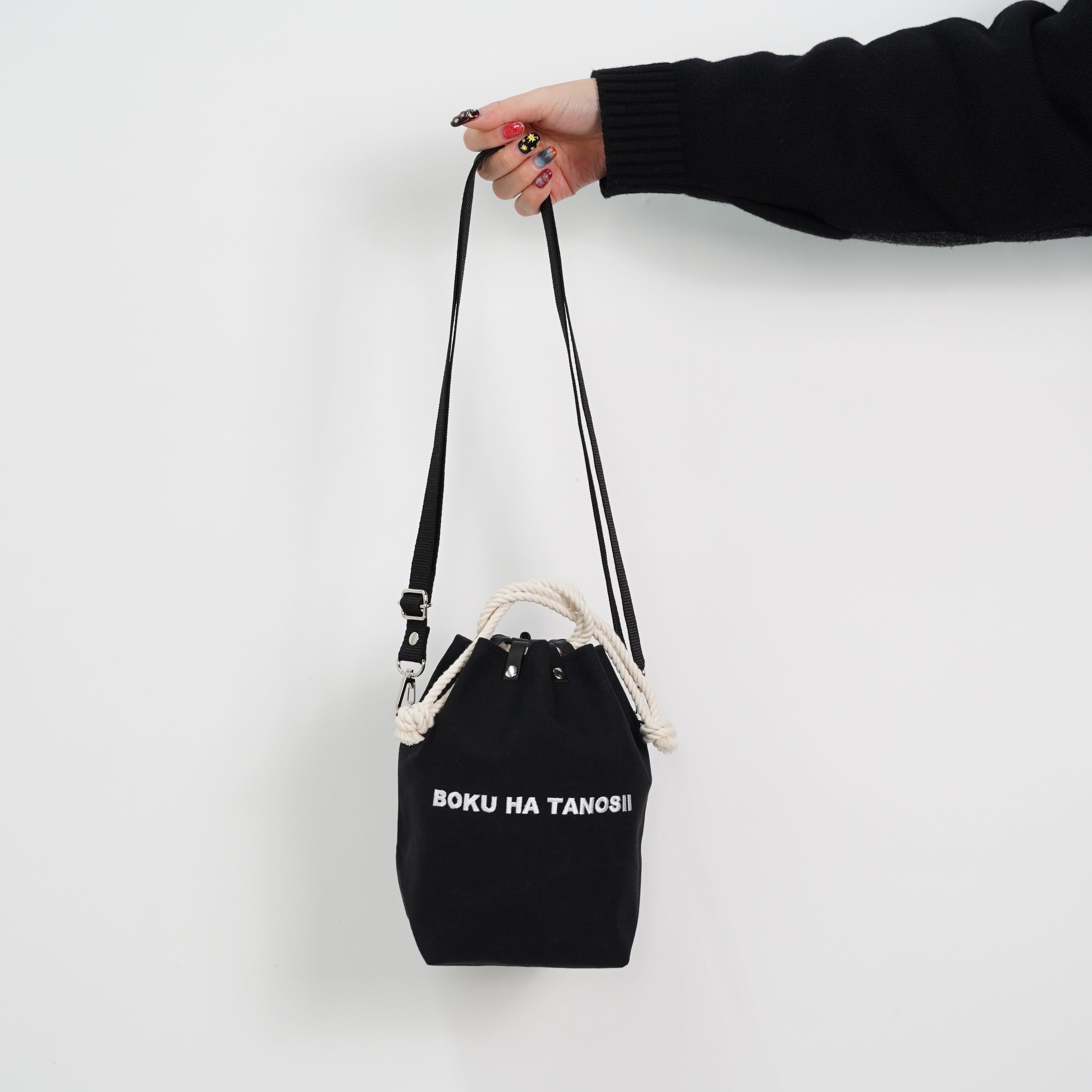 またストラップを取り外し、ロープを手首に巻いて持つと巾着感が増しグッと [和] の匂いが強まります。