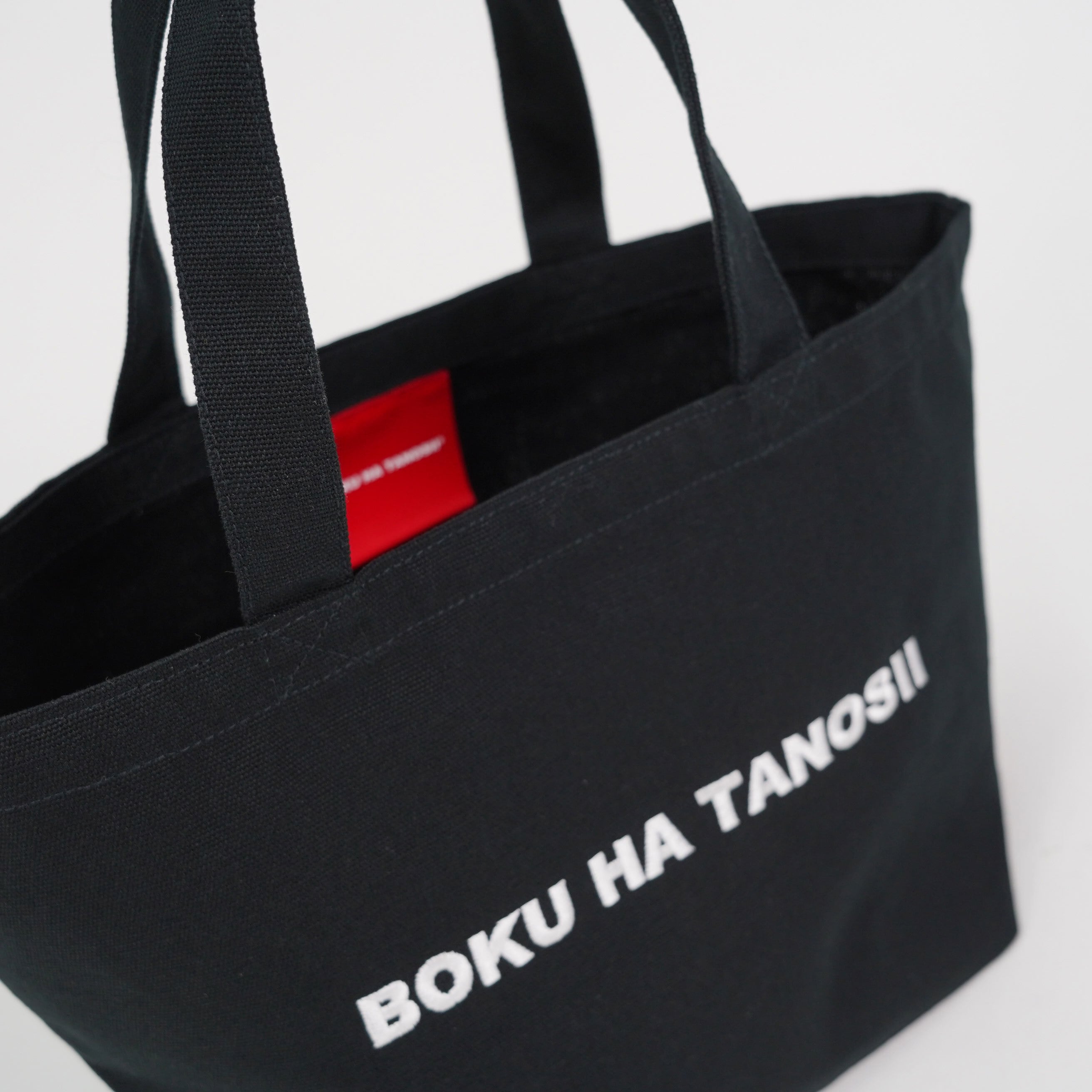 ブラックのキャンバス生地にホワイト刺繍で施されたBOKU HA TANOSII