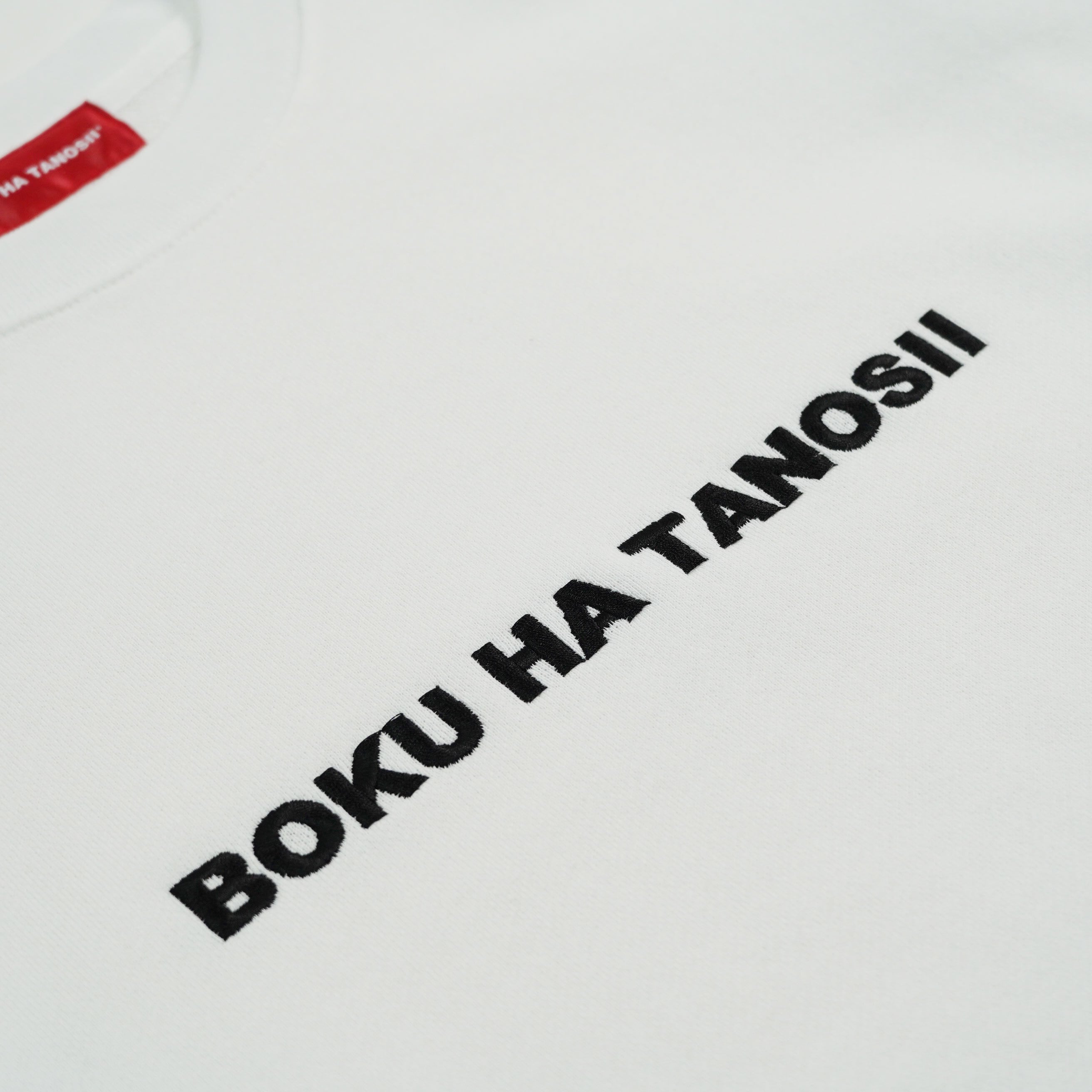 ホワイトにブラック刺繍で施されたBOKU HA TANOSII