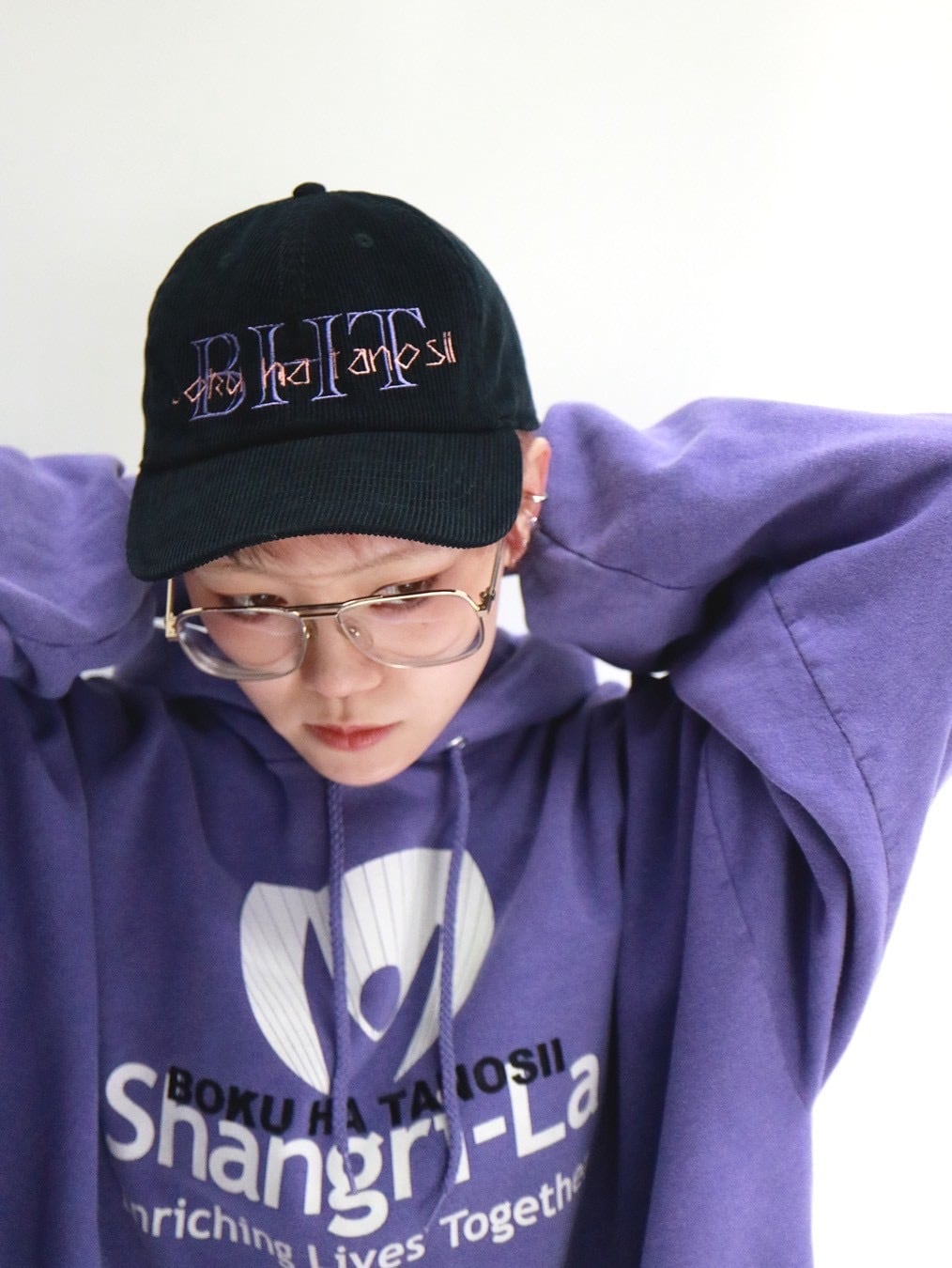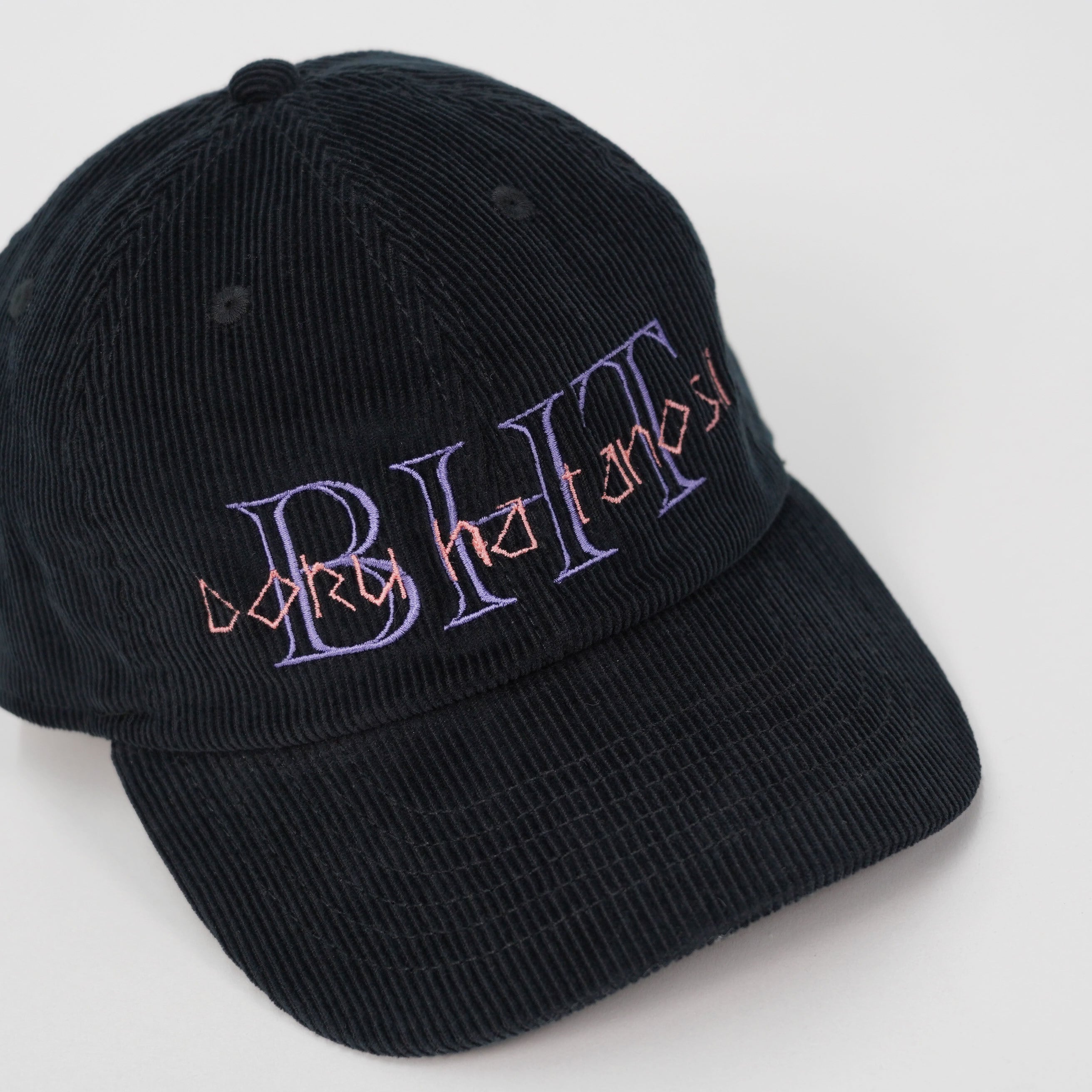 ブラックボディのコーデュロイにパープルとピンクの刺繍で施されたBOKU HA TANOSII