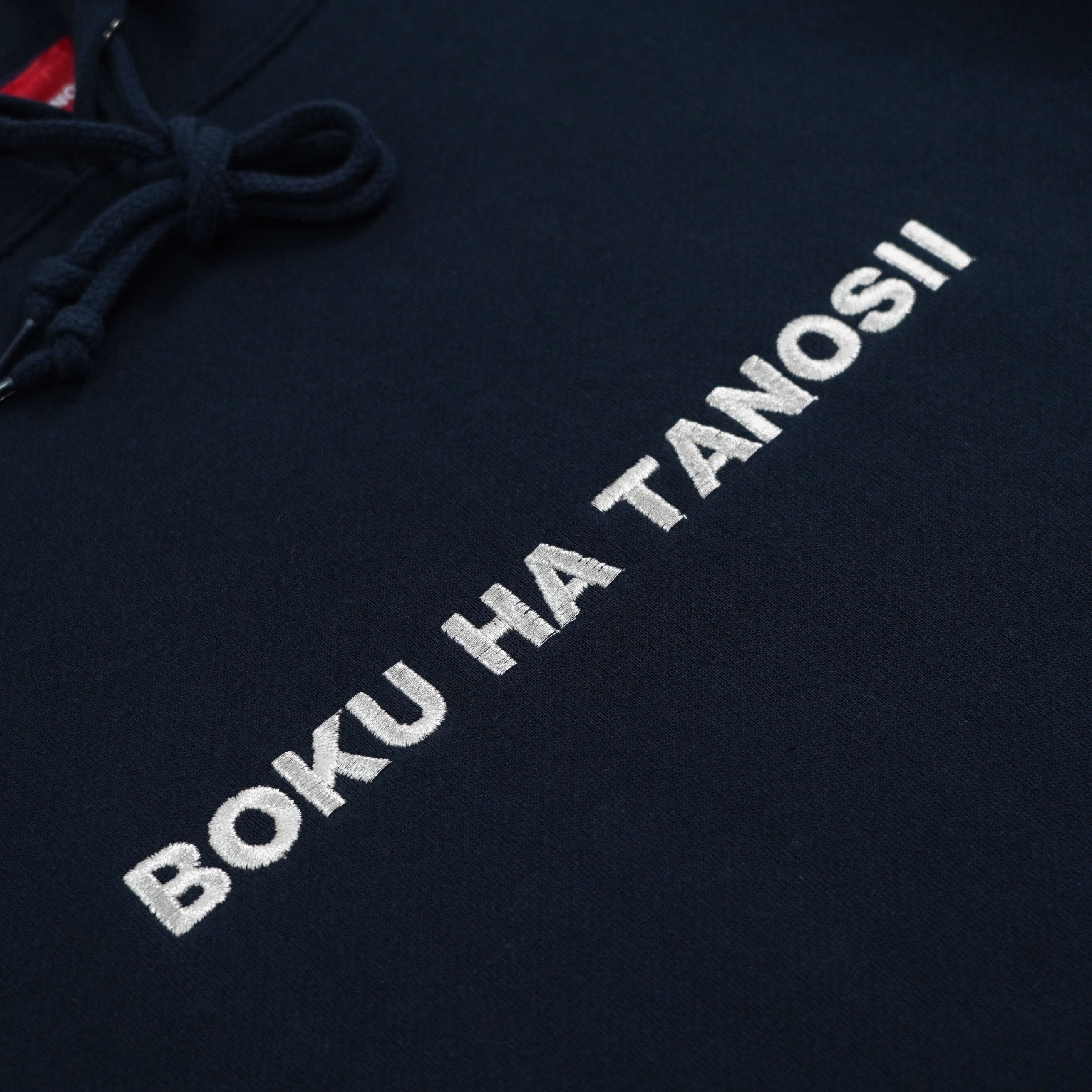 ネイビーにシルバー刺繍で施されたBOKU HA TANOSII