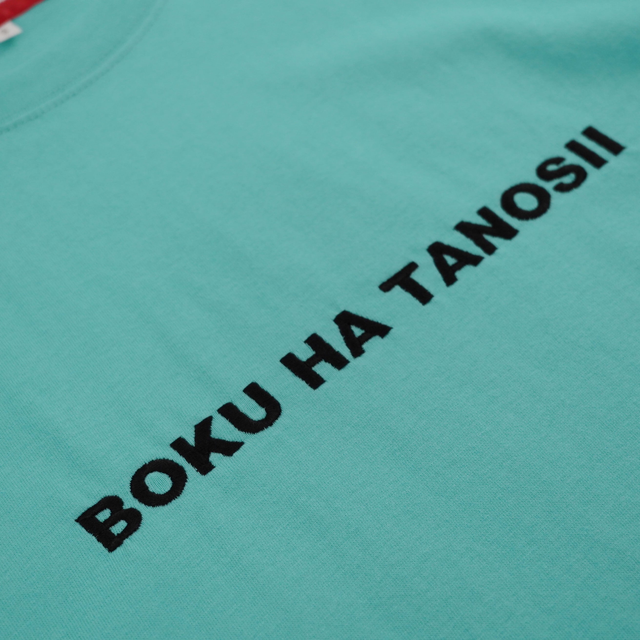 ティファニーブルーボディにブラック刺繍で施されたBOKU HA TANOSII