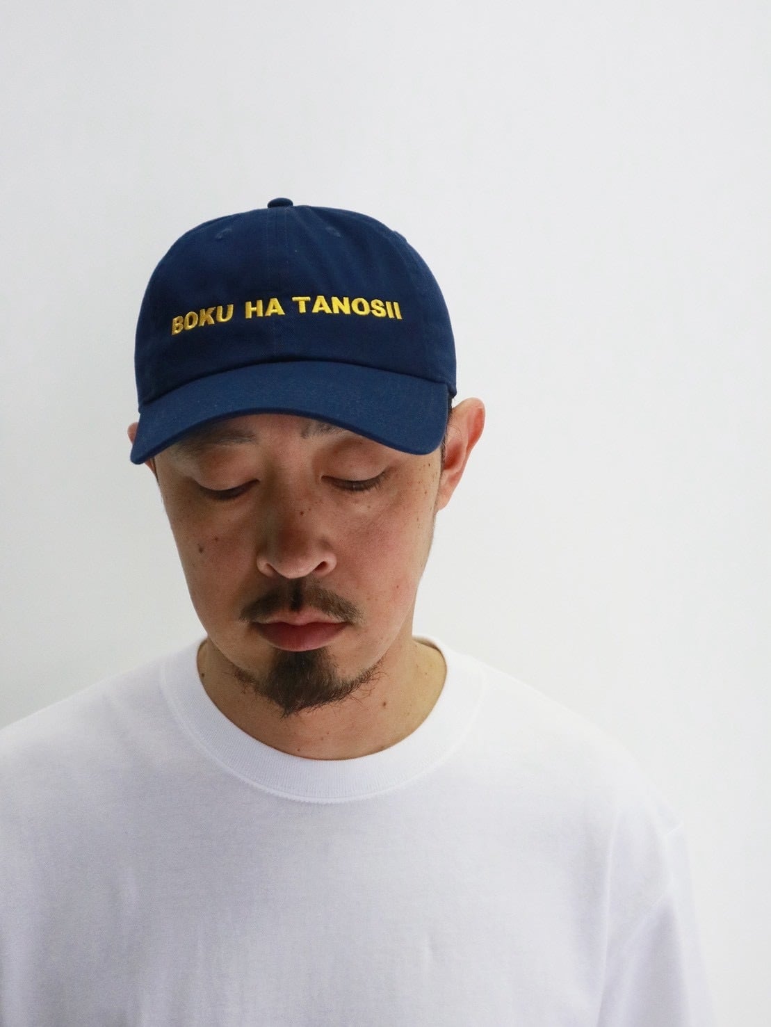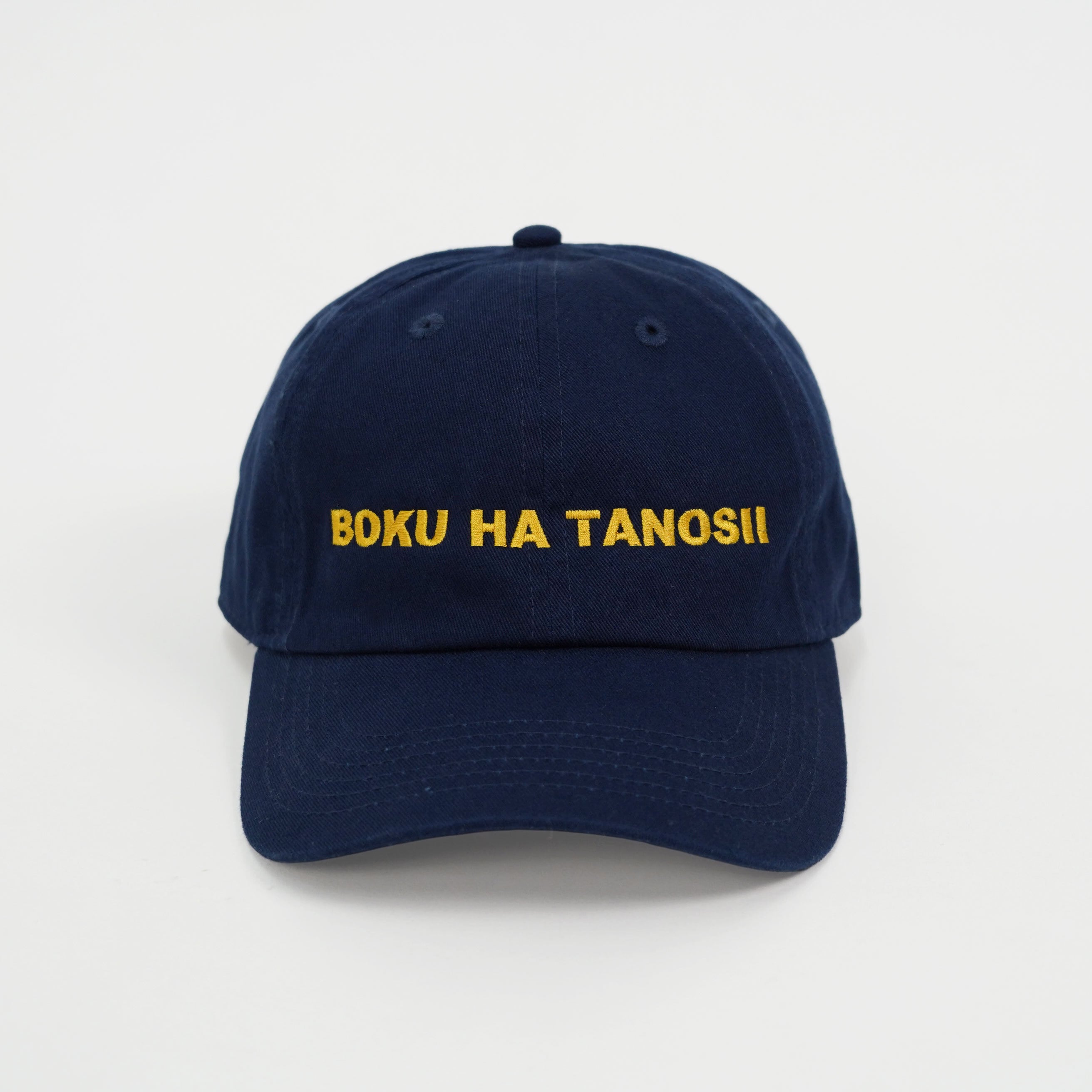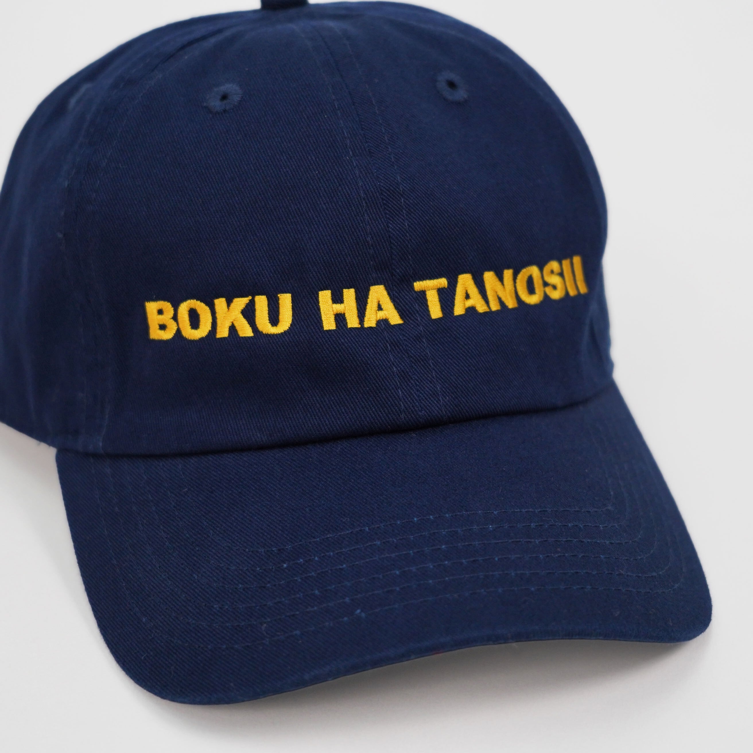 ネイビーボディにイエロー刺繍で施されたBOKU HA TANOSII