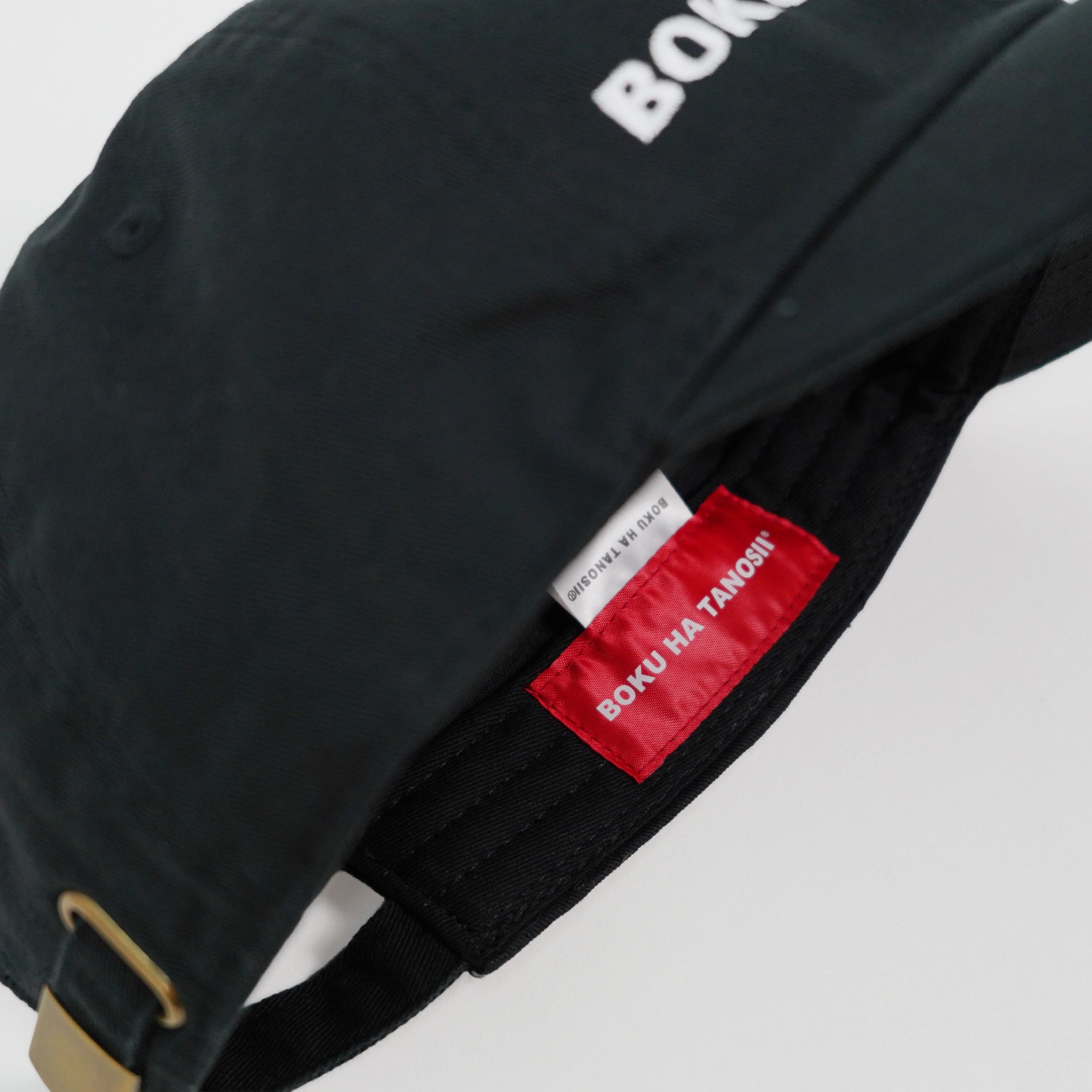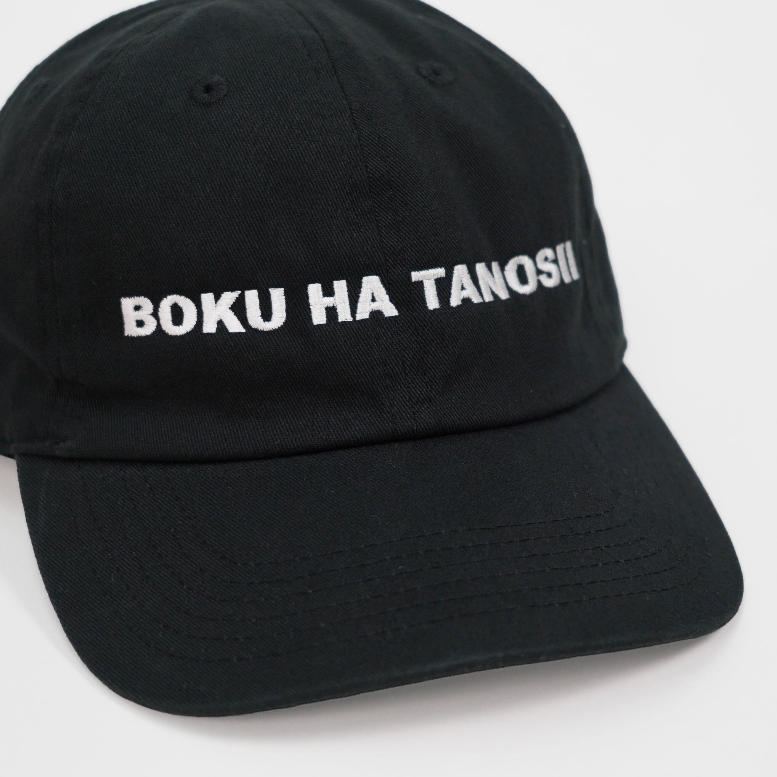 ブラックボディにホワイト刺繍で施されたBOKU HA TANOSII