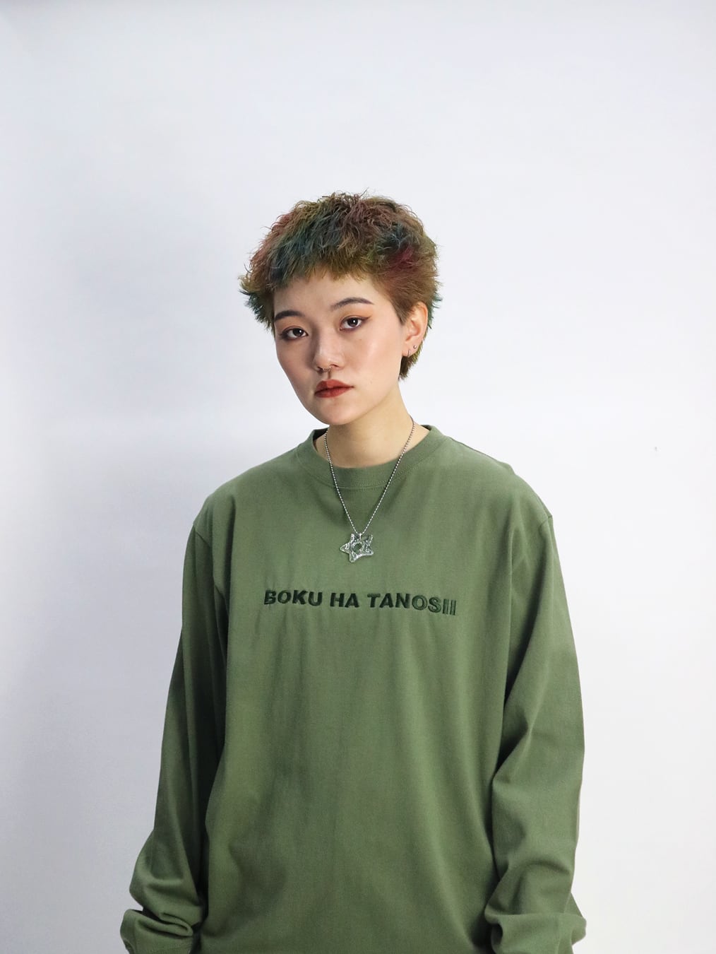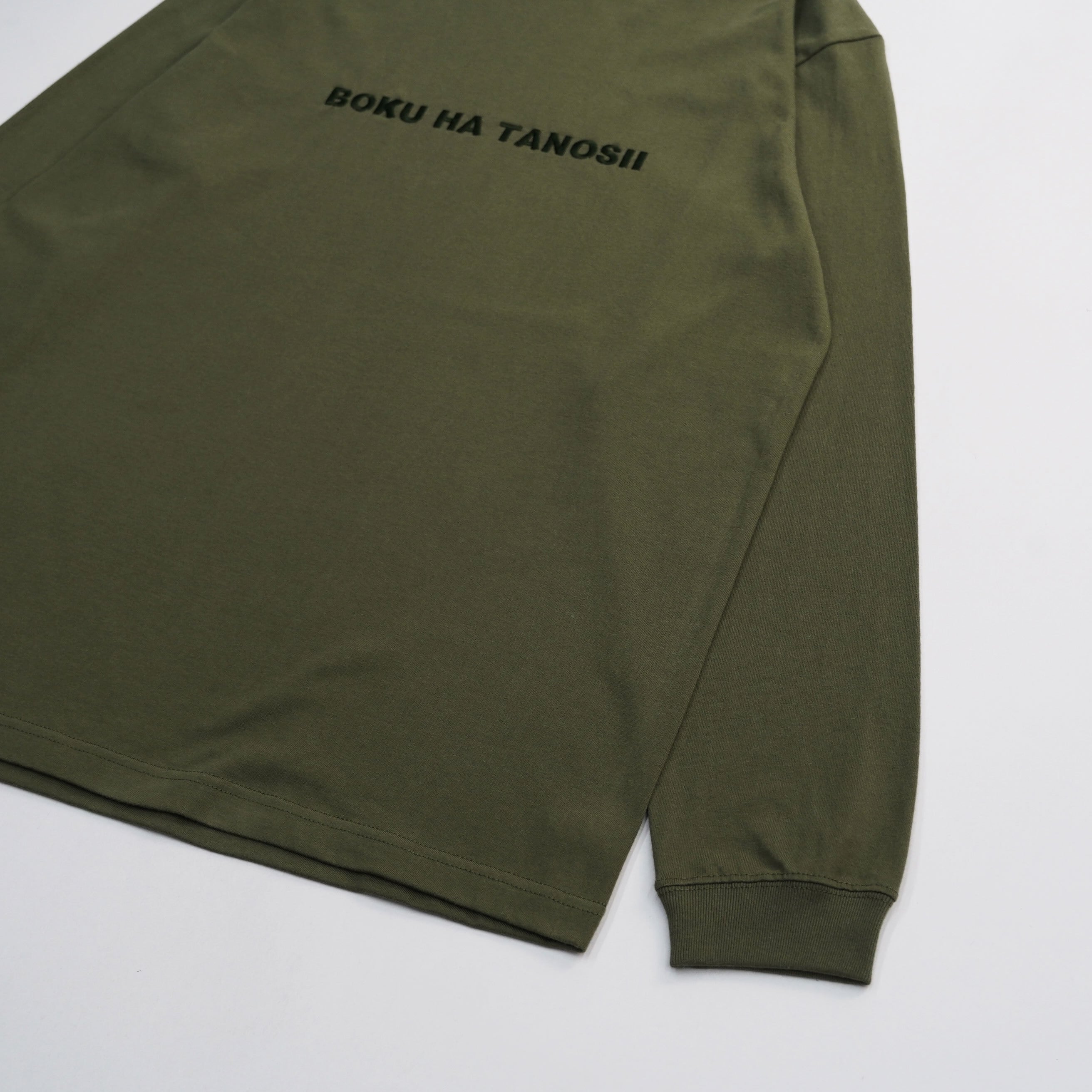 オリーブボディにオリーブカラーの刺繍で施されたBOKU HA TANOSII
